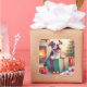 Perfect for dog lovers with a sense of fun! This adorable Pitbull unwrapping gifts adds joy and color to seasonal décor. A great holiday wall art choice or unique Christmas gift.
