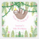 Luz divertida e selva verde escura deixam decorar este tema da selva | obrigado de aniversário de preguiça, seus adesivos. preguiça de festa pendurada numa vinha na selva. Flores brancas, amarelas e rosadas decoram as folhas da selva. Perfeito para animais, jardins zoológicos, preguiças ou outros safari/aniversário do tema da selva.