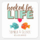 Adesivos adoráveis de save the date com dois peixes fofos virados um para o outro com um coração de amor vermelho flutuando acima deles. Um peixe é azul e o outro é laranja. Acima estão as palavras "Presos Na Vida" em um texto marrom e verde aqua pastel. Abaixo dos peixes estão modelos para adicionar os nomes dos noivos e a data.