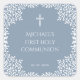 Este elegante desenho religioso azul e branco com ar vintage, recomendado para a primeira comunhão de um menino, tem uma moldura ornamentada com galhos intrincados com folhas. Acima do texto há uma cruz religiosa. O fundo é azul empoeirado, o texto, a cruz e a moldura de folhagem são brancos.