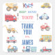 Primeiro aniversario de Transporte de Meninos Modernos Obrigado obrigado de aniversário de transporte do garoto Pau-Pau-Pau-Pau de aniversário com vários veículos e texto colorido. O cartões de agradecimentos de primeiro aniversario deste rapaz pode ser usado para qualquer idade.