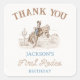 O primeiro rodeio do Cowboy Primeiro Rodeio primeiro aniversario Quadrado do Sticker Boy foi o primeiro rodeio do primeiro obrigado de aniversário que você cola com um vaqueiro e cavalo, paisagem desértica e um texto de estilo corda.