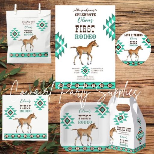 Primeiro padrões rodeio turquesa do sudoeste do país, pequeno cowboy cavalo do estilo ocidental festa de aniversário personalizado obrigado que você cola. Para meninos e para meninas, o aqua e as cores marrons podem combinar muitos itens de decoração e outras coisas.
