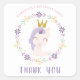 Crie a sua princesa de Unicórnio Magical Pink personalizada | Aniversário Obrigado Stickers usando estas modelos pela Cali Graphics. Este design bonitinho apresenta um unicórnio rosa pincelado com cabelo roxo e uma coroa dourada brilhante em uma coroa floral branca.