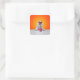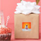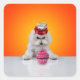 O Cupcake Pup. Fundo cor de laranja brilhante e colorido, com um filhote maltês a vestir uma coroa vermelha a querer um glacé de espiral cor-de-rosa do cupcake.