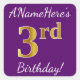 Este simples design de aniversário apresenta uma mensagem como "ANameHere's aniversário de 3 anos!", com o "3º" a ter uma aparência de cor falsa/imitada inspirada em ouro, num fundo cor roxo. O nome pode ser personalizado. Os adesivos como estes poderiam talvez ser um presente para alguém que comemora o seu terceiro aniversário, ou talvez pudessem ser usados como decorações numa festa de aniversário. [~Z0000246]