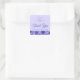 Square business thank you stickers featuring your custom logo and the text "Thank you” in an elegant script font with customizable text below. Along the bottom edge edge is a purple flower pattern border.