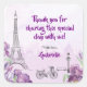 Digam merci aos seus convidados com um adesivo de aquarela roxo perfeito para um evento temático em Paris. A Torre Eiffel está rodeada por belos iriscos roxos com uma silhueta parisiense no fundo. Personalize o adesivo de um casamento temático parisiense, chá de panela, festa de noivado, comemoração de aniversário ou festa de aniversário. Use em favores para dizer obrigado ou como selos de envelope. Disponível com produtos correspondentes.