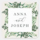 Coloque o seu convite em envelopes ou favores com estes elegantes adesivos botânicos de inverno que apresentam os seus nomes enquadrados por uma borda quadrada de uma folhagem de aquarela em tons de verde, num fundo de marfim de creme macio. Coordena-se com a nossa coleção de casamentos de Estufa.