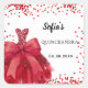 Para uma Quinceañera, 15 festa de aniversário. Um fundo branco com confete vermelho, um vestido e um grande arco vermelho. O nome é escrito com um moderno estilo escrito à mão. Personalize e adicione seu nome e uma data.