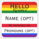 Um design de adesivo arco-íris com as palavras clássicas "Olá, Meu Nome É", mas com os "Meus pronomes são" adicionados. Se necessitar dos seus próprios autocolantes pré-impressos, introduza-os. Caso contrário, apague o nome e pronome para uso geral. Isso permite que os participantes da reunião compartilhem seu nome e pronomes. Crie um ambiente inclusivo e aberto com este adesivo simples, mas impactante. Isto promove um ambiente de compreensão e respeito, incentiva a comunicação aberta e ajuda a criar um ambiente comunitário mais inclusivo.