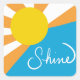Raios Sunshine de Felicidade por @ Cathy Thompson. Grande sol explosivo com as palavras positivas "Shine" na frente. As cores são laranja, azul e branca.