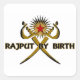 Frase, "Rajput By Birth", com duas espadas de guerra indianas, destacadas por um nascer de ouro pontiagudo segurando uma estrela vermelha ao fundo.