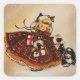 Menina de saia grande e castanha olhando para um filhote preto e branco.
