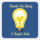 Você está procurando uma maneira barata de reconhecer os funcionários que vão mais longe para sua empresa? Este adesivo quadrado apresenta uma lâmpada amarela brilhante contra um fundo azul escuro. "Obrigados para ser uma lâmpada brilhante" podem ser facilmente personalizados para atender às necessidades de sua empresa.