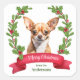 On these Holiday envelope sealer stickers, a watercolor portrait of an adorable brown and white Chihuahua dog is surrounded by a red berry holly wreath. At the bottom is a red banner with your custom Christmas greeting, and your signature is in green beneath it.
