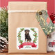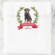 Nestes autocolantes de correspondência Feriados, um retrato de aquarela de um Cão Rottweiler é cercado por uma coroa de groselha vermelha. Na parte inferior está uma faixa vermelha com sua saudação de Natal personalizada, e sua assinatura está em verde embaixo dela.