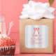 This coquette baby shower sticker features a red bow on a cream background with pale blue stripes. Personalize it for your needs. You can find matching products at my store.