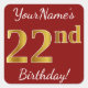 Este simples design de aniversário apresenta uma mensagem como "22º Aniversário do Vosso Nome!", com o "22º" a ter uma aparência falsa e imitada de cor inspirada em ouro, num fundo de cor vermelha. O nome pode ser personalizado. Os adesivos como estes poderiam talvez ser um presente para alguém que comemora o seu vigésimo segundo aniversário, ou talvez pudessem ser usados como decorações numa festa de aniversário. [~Z0000245]
