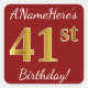 Este simples design de aniversário apresenta uma mensagem como "ANameHere's 41rua Birthday!", com a "41ruas" a ter uma aparência falsa e imitada de cor inspirada no ouro, num fundo de cor vermelha. O nome pode ser personalizado. Os adesivos como estes podem talvez ser um presente para alguém que comemora o seu quarenta primeiro aniversário, ou talvez possam ser usados como decorações numa festa de aniversário. [~Z0000245]