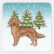 A ilustração original de um desenho animado de um cão da raça Retriever, Ouro vermelho ou castanho-avermelhado de mogno fofo. O cão é colocado numa cena de inverno com três árvores de abeto verde e neve caindo. O fundo é um gradiente azul a branco que dá à design aquele olhar frio do dia de inverno.