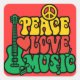 Digite design de PEACE, LOVE & MUSIC com guitarra, Símbolo de Paz, Notas de Coração e Música em amarelo, vermelho e verde.