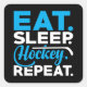 Coma o design do Hockey com Sono Repetidamente com texto azul e branco sobre fundo preto, um design excelente sobre travesseiros, canecas, adesivos e outros itens para jogadores de hóquei!