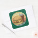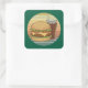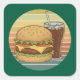 A colorful illustration depicting a juicy burger with cheese and lettuce, alongside a glass of iced cola. The overall design is retro, with pastel stripes in the background evoking the aesthetic of old-time bars and diners. The graphic perfectly captures the classic taste of fast food in a nostalgic, stylized version.