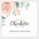 Um fundo branco na moda. Decorados com ouro rosa verde e cor-de-rosa esbranquiçada floral, rosa, folhas de eucalipto, prigos, verde, folhas de ouro falsas. Personalize e adicione seu primeiro nome, iniciais do monograma e nome do cheio. Perfeito para favoritos para festas, selos de envelope, obrigado cartões.