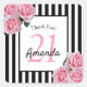 Um adesivo para uma festa de aniversário de 21 anos. Listras verticais negras e brancas clássicas como fundo. Com rosas rosadas femininas e femininas como decoração. Com o texto curvo: Obrigado! Um quadro branco e negro na frente com modelo para a idade, o nome e a data. Número de idade 21 em rosa, nome e data em preto. O nome é escrito com um script de estilo manuscrito.