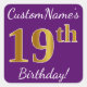Adesivo Quadrado Roxo, Faux Dourado 19º Aniversário + Nome Personal
