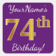 Este simples design de aniversário apresenta uma mensagem como "74.º Aniversário do Vosso Nome!", com o "74.º" a ter uma aparência falsa e imitada de cor inspirada em ouro, num fundo cor roxo. O nome pode ser personalizado. Os adesivos como estes podem talvez ser um presente para alguém que comemora os seus setenta e quatro anos, ou talvez possam ser usados como decorações numa festa de aniversário. [~Z0000246]