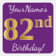 Este simples design de aniversário apresenta uma mensagem como "O 82º Aniversário do Vosso Nome!", com o "82º" a ter uma aparência falsa e imitada de cor inspirada em ouro, num fundo cor roxa. O nome pode ser personalizado. Os adesivos como estes podem talvez ser um presente para alguém que comemora o seu oitenta segundo aniversário, ou talvez possam ser usados como decorações numa festa de aniversário. [~Z0000246]