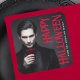 Boas vindas de Halloween, com um vampiro pálido e bonito segurando um copo de sangue e o texto "Feliz Halloween" em uma fonte vermelha, ornamentado e angustiada. Nome ou texto personalizável.