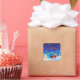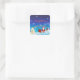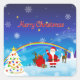 Linda paisagem de neve com uma árvore de Natal, flocos de neve, e um arco-íris sobre o céu. Papai Noel está acenando e duas renas estão juntas para distribuir presentes de Natal.