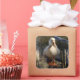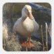Foto de um pato da Saxónia parado na borda das lagoas e encarando a câmera.
