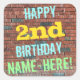 Este design de autocolante de aniversários divertido apresenta uma mensagem como "segundo aniversário FELIZ, NOME AQUI!", onde o nome pode ser personalizado. O fundo apresenta uma representação de uma parede de tijolos constituída por alguns tijolos de cor castanha avermelhada. O texto de mensagem personalizável apresenta cores como azul, amarelo e verde, e tem uma aparência inspirada pela do grafite pintado. Os adesivos como estes poderiam talvez ser dados como presente de aniversário, ou talvez utilizados como decorações numa festa de aniversário para alguém que comemora o seu segundo aniversário. [~Z0000273]
