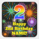 Este empolgante e alegre design do adesivo quadrado com tema de aniversário apresenta um grande número "2" com um padrão colorido inspirado no espectro do arco-íris, juntamente com a mensagem "segundo aniversário Feliz", e um nome editável. O fundo apresenta um padrão colorido inspirado pela aparência de fogos de artifício comemorativos em explosão. Cartazes divertidos e personalizados como este podem ser dados como presente de aniversário, ou usados enquanto embrulham presentes/presentes, ou talvez usados como decoração de festas de aniversário quando celebram o segundo aniversário de alguém. [~Z0000579]
