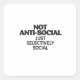 A bold, monochromatic typographic statement in a dark, minimalist style. The text reads: "NOT ANTI-SOCIAL JUST SELECTIVELY SOCIAL" using a clean, heavy-weight font. The subtle contrast of dark grey on black creates an understated, cool, and mysterious aesthetic, perfectly reflecting the sentiment of the quote. This design is ideal for introverts, individuals who value their personal space, or anyone making a clear, unapologetic statement about their social preferences. Excellent for modern apparel and prints.