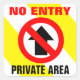 Entrada não permitida de autocolantes de sinal de área privada. Ícone sem sinal de entrada quadrado com uma seta preta para cima com uma diagonal vermelha que não permita faixa e adesivo de borda redonda com texto vermelho totalmente personalizável "No entry" e texto preto "Private area" contra uma faixa de aviso branca amarela diagonal listrar quadrada pequena folha adesiva. Este produto de aviso proibido de entrada/saída é totalmente personalizável, adicione seus textos pessoais e sua imagem. Um excelente sem aviso de entrada para a porta do seu espaço de trabalho ou cubículo ou porta de garagem em casa.
