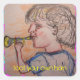 uma menina tocando um trompa de brinquedo a partir de um esboço colorido de lápis. também com o slogan "toot your own horn"