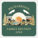 Estes adesivos de reunião familiar personalizados foram criados para uma festa temática, viagem e festas de acampar. O design apresenta uma paisagem típica com montanhas, uma floresta de pinheiros e um lago em fundo verde. Digite seu nome de família e ano através do modelo para personalizá-los facilmente.