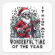 This sticker features a skeleton wearing a Santa Claus suit and hat, playing a red electric guitar. The design is set in a snowy landscape with stylized pine trees and star-like sparkles. The text reads, "IT'S THE MOST WONDERFUL TIME OF THE YEAR". The design may look real due to the high detail and three-dimensional texture in the artwork.
