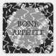 Skeletons sobre fundo preto e BONE APPÉTIT em letras quicas, esses adesivos são divertidos para seus convites para festas de Halloween ou favoritos para festas. CORRESPONDENDO a itens na nossa loja.