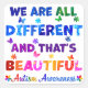 Citação inspiradora de "Somos Todos DIFERENTES E Isso é LINDO" com quebra-cabeça autistas únicos, e borboletas coloridas voando em segundo plano para apoiar e defender a consciência do autismo.