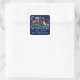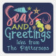 Seas and Greeting Beach Summer Square Stickers mostra o texto "Seas and Saudações" em uma tipografia de escrita de caligrafia moderna, destacada por um cavalo de mar festivo e conchas com seu nome personalizado. Criado pelo Evco Studio www.zazzle.com/store/evcostudio