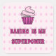 Divertido para cozinheiros e especialmente para quem gosta de cozinhar. A legenda está em rosa "Baking is my superpower" sobre um fundo de pequenos cupcakes cor-de-rosa, e a imagem principal é de um cupcake cor-de-rosa com espirais de gelo cor-de-rosa.