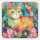 A vibrant cat with striking green eyes is surrounded by a lush array of colorful flowers and leaves. The use of bold hues like orange, teal, and pink creates a whimsical and enchanting scene.