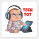 Uma imagem cartoonesa de um bebê gordinho com uma sobrancelha pelada, vestindo fones de ouvido sobredimensionados e uma roupa decorada para bebês com ícones de computador, tocando com confiança uma tela de tablet.