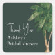 Tropical verde script palmeira chuveiro de noiva obrigado adesivo com ilustração de palmeira exótica aquarela e tipografia de pincel elegante. Perfeito para festa de chuveiro de noiva de primavera verão.